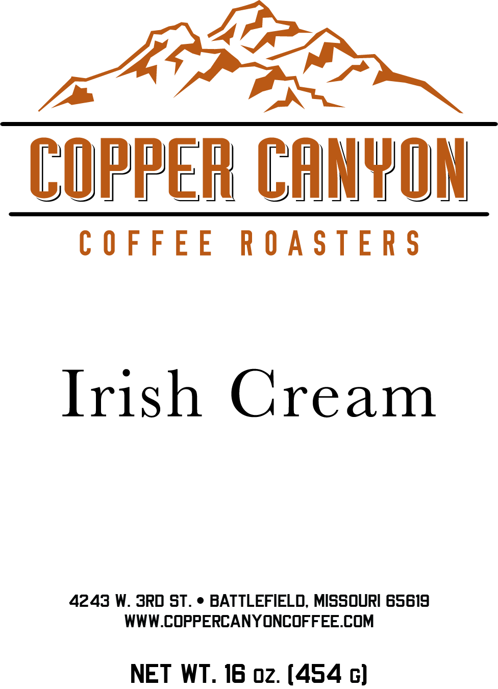 Copper Canyon's Irish Cream Flavored Coffee is available in a 16oz bag, whole bean or ground.