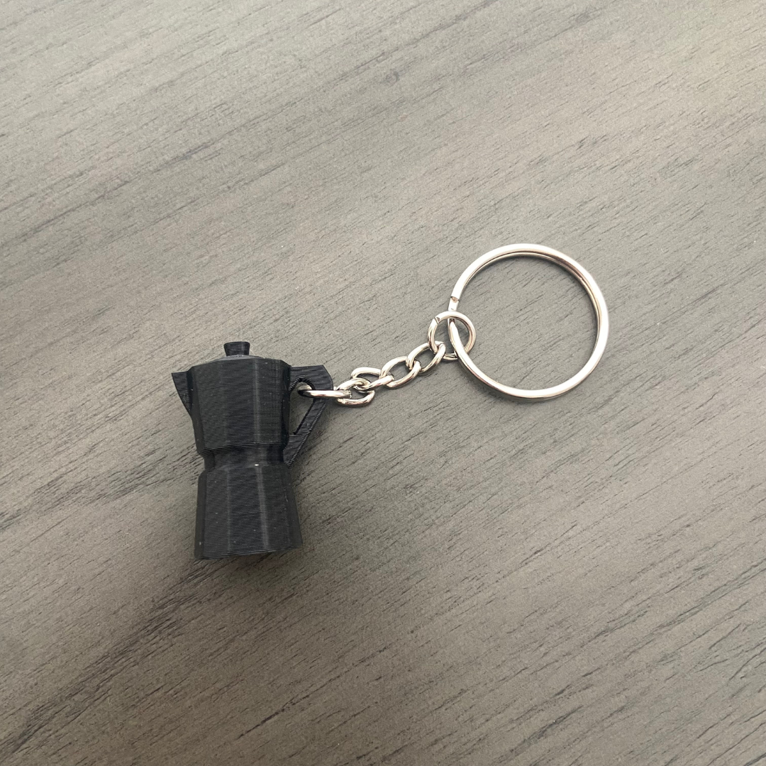 3D printed key chain with a black Moka Pot.